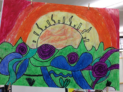 Aquest cop amb retolador i les ceres hem plasmat unes postes de sol en el mar ben boniques.